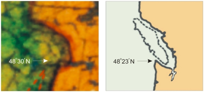 A 400 year old English globe provides irrefutable proof that the great Elizabethan seaman-adventurer Francis Drake explored and claimed the British Columbia coast for Queen Elizabeth I in the year 1579—two centuries earlier than the first Europeans were previously believed to have reached this coast. The globe, made by contemporary cartographer and instrument-maker Emery Molyneux,1 depicts Drake's epic voyage around the world in 1577-80 and contains information that so closely matches the actual British Columbia coastline that it could only have been based on Drake's firsthand observations of the coast. The Proof On the globe, the track of Drake's voyage reaches northward on the Pacific coast of North America to latitude 48ºN, where there is a large and distinctive indentation in the coastline. Adjacent to this feature, Nova Albion, meaning New England, is inscribed straddling the 50th parallel of latitude. Below, Drake's name is inscribed in Latin. (Figure 2) Because Molyneux's detail is drawn at a small scale, it shows only the general trend of the coast. But anyone who has studied a modern map of this coast will easily recognize that this large indentation closely matches the mainland coast behind Vancouver Island. One need only imagine what the modern map would look like with Vancouver Island removed, and they will get essentially the same picture as one sees on this globe. (Figure 3) |